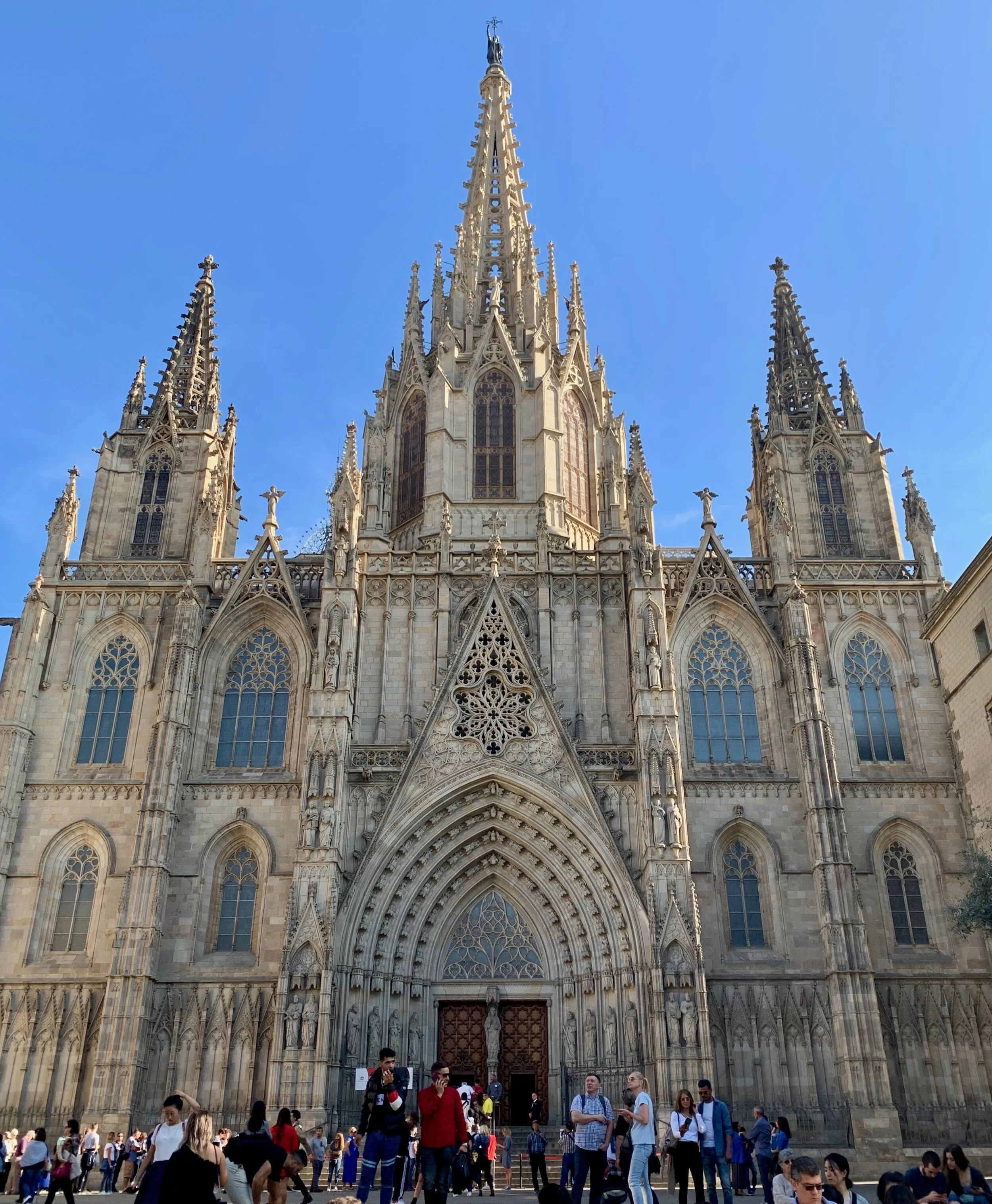 I locked the cat outside the room, so I slept peacefully for the first time that night. The cat knew what I did and gave me a look in the morning. I left early Sunday morning because I wanted to see the Gaudi Apartments and more of the city before meeting my friends at La Sagrada Famiglia. I saw the apartments and found some protests too. But then I got hungry, and I met my friends at a rooftop bar overlooking the basilica. I ate a prosciutto and tomato sandwich that was good and then had Sangria, which I had several glasses of, all while looking at La Sagrada Famiglia, one of the largest and prettiest churches in the world. Then we took a train to Camp Nou, where the soccer team FC Barcelona plays, and I got a jersey. We walked back into the city, saw some more protests, saw some more pretty buildings, got dinner near the water, and then I headed back to the apartment, as I had an early morning to catch my flight back to Florence for school